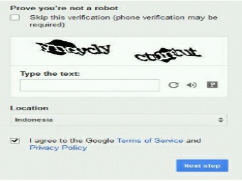 • Create password : Silahkan isi dengan kata dan huruf yang unik minimal 8 karakter. Ketika anda membuat password email kode yang anda ketik atau di isi pada kotak isian harus kuat atau susah di tebak, jangan menggunakan tanggal lahir anda atau orang terdekat sebisa mungkin yang unik. Dan untuk menjaga kode email google ini ada 2 cara pengamanan dengan memasukan nomor ponsel anda, bila anda masuk pada suatu browser dan ingin membuka layanan google menggunakan email gmail maka anda di minta kode verifikasi dari nomor ponsel tersebut, setelah mengetikan 6 kode verifikasi maka anda akan bisa masuk membuka layanan google.