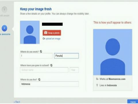 8). Berikutnya agar anda di kenal dengan profil google plus silahkan isi informasi anda seperti sekolah dan pekerjaan, menambahkan foto profil dan setelah itu klik Finis dan anda akan menuju halaman baru Google+ Plus.