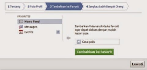 Kemudian di tahapan selanjutnya apakah fanspage tadi ingin di simpan di menu favorit bila tidak lewati saja.
