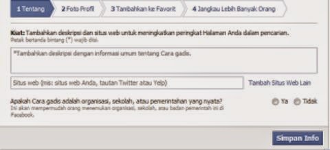 Untuk selanjutnya isi informasi tentang Fanspage dan Situs Anda. Silahkan isi dengan kalimat sesuai tujuan fanspage tadi. Kemudian beri tanda centang dan klik tombol ” Ya “. selanjutnya klik Simpan info.