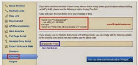- Selanjutnya copy kode scriptnya yang sudah tersedia dan kode akun adfly akan berbeda satu akun dengan yang lainnya biasanya berupa angka unik