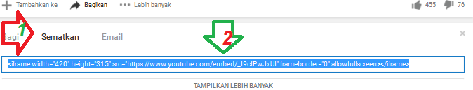 3). Nah di halaman youtube dan letaknya di sebelah tengah ada tombol sematkan ( lihat tanda panah nomor 1 pada gambar diatas) maka akan muncul kode embeed url video tersebut dan silahkan copy kodenya ( gambar panah nomor 2).
