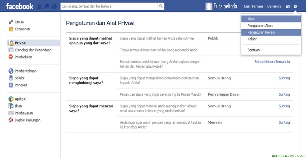 Privacy pada akun Facebook Anda ini untuk mengontrol akun Anda untuk umum atau teman dan sesama teman, sperti update status pengiriman, menyembunyikan email dan masih banyak yang lainnya silahkan seting sesuai kehendak.