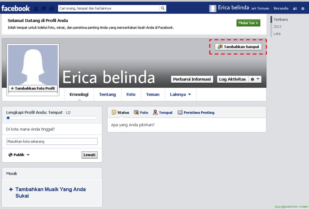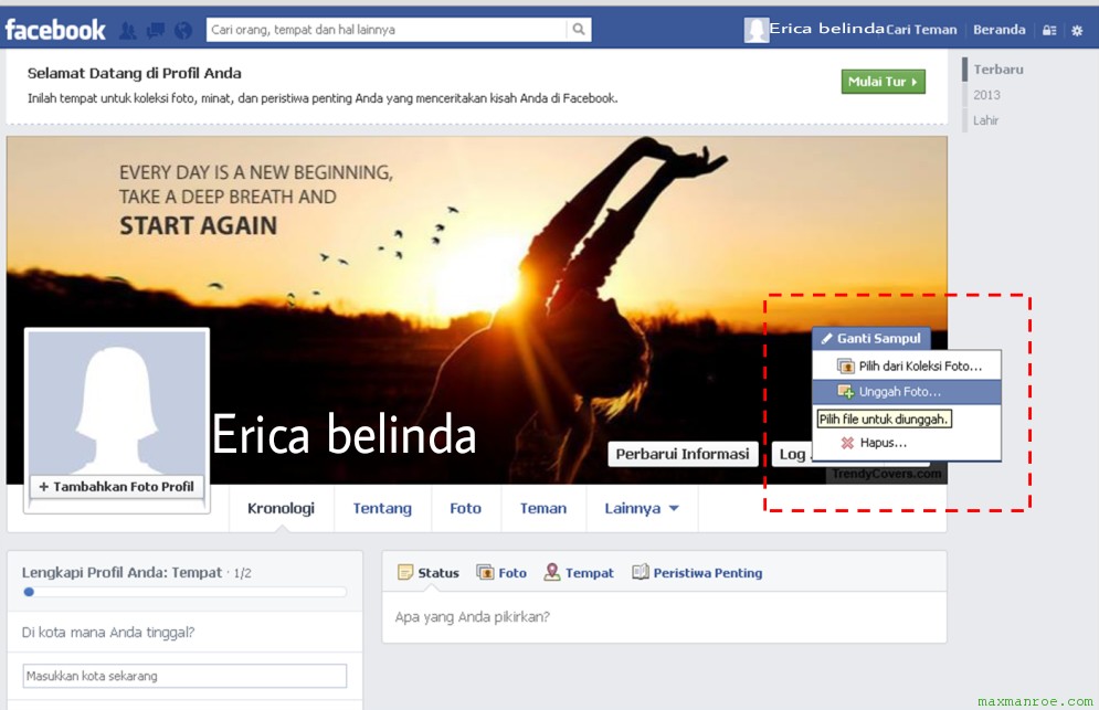 Kemudian silahkan klik tulisan “Tambahkan sampul” yang terletak di atas bagian kanan akun Facebook Anda. Selanjutnya Anda aploud gambar menurut kesukaan Anda dan bila cover atau sampul ingin di ganti silahkan ganti lagi sesuaikan dengan keinginan. Seperti screenshot di bawah :