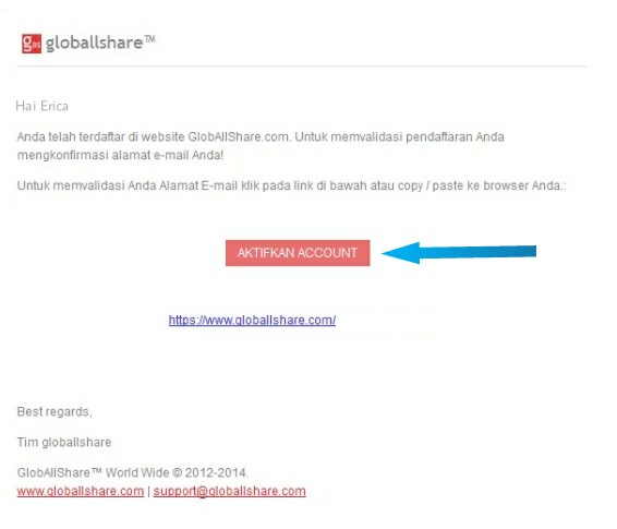 3) Setelah itu silahkan buka email Anda untuk daftar tadi maka akan ada konfirmasi dari fihak Globallsahre untuk meneruskan pendaftaran hingga selesai dan kemudian klik link yang tersedia.