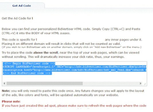 15). Silahkan copy kode iklan yang muncul dan pastekan di template atau di pasang pada sidebar tempalte yang anda sukai, Simpan dan anda berhasil menayangkan iklan PPC dari bidvertiser.