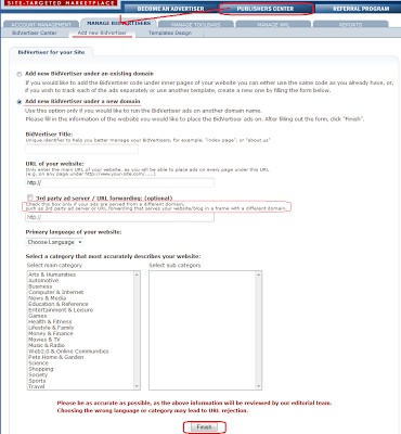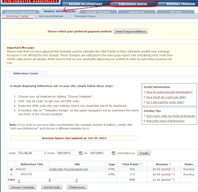 12). Kemudian Anda langsung ke halaman menu “ Publisher Center ” dan selanjunya ke “ Manage Bidvertisers ” dan kemudian ke “ Bidvertiser Center “.