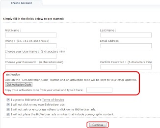 3). Kemudian akan ada halaman baru silahakan isi semua data yang diperlukana mulai dari “ Email ” isi dengan email anda yang aktif gunanya untuk konfirmasi nanti, ” Username dan Password ” isi dengan username dan password anda yang unik karena username dan passwotd untuk nantk masuk ke akun bidvertiser selanjutnya klik tuslisan ” Get activation code “.