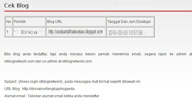 4). Setelah Anda klik daftar tadi maka akan muncul halaman baru dengan kalimat tulisan seperti ini: Anda baru saja mendaftarkan diri pada jaringan IdBlogNetwork dan silahkan tunggu proses persetujuan atau di approve dari Tim IdBlogNetWork dengan menganalisa isi blog Anda, bila blog sesuai kriteria dan syarat daftar IdBloNetWork maka akan cepat mendapatkan email pemberitahuan ke email Anda.