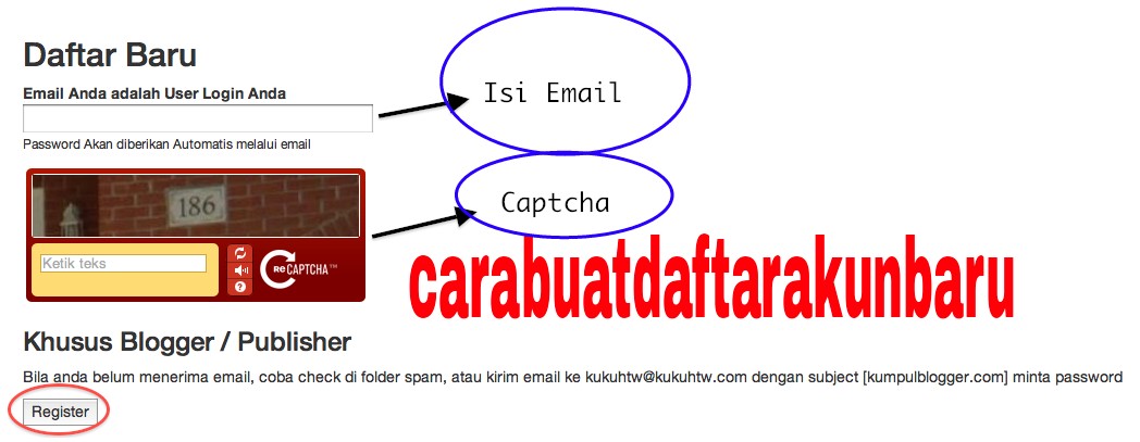 • ” Email ” : Isikan dengan alamat email yang masih aktif atau valid karena email untuk masuk ke akun kumpul blogger nanatinya setelah di konfirmasi.