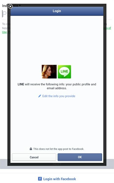 8). Selanjutnya anda diminta untuk login ke akun facebook dan klik konfirmasi atau Authorizaton pada Line di Facebook.