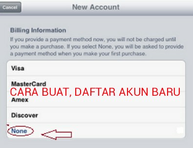 Halaman baru akan terbuka ada beberapa pilihan yang di berikan oleh Apple Corp seperti Mastercard, Visa, Amex dan None . Pilihlah tulisan ” None “.