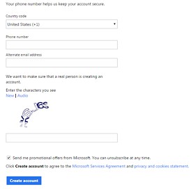 • ” Phone ” : Pada bagian ini silahkan isi dengan nomor ponsel Anda yang masih aktif, dan masukan kode angka yang tersedia pada kolom ” Enter the characters you see ” dan setelah selesai memasukan angka yang tertera tadi silahkan ceklis kotak kecil dan klik pada tombol yang ada tulisan ” Create account “.