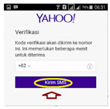 (j). Maka akan terbuka halaman verifikasi dari tim Yahoo dan silahkan isikan nomor Hp/ponsel Anda dan klik tombol Kirim SMS.
