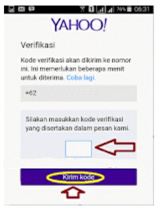 (k). Buka kotak masuk sms HP Anda maka ada SMS dari tim Yahoo memberikan kode konfirmasi, kemudian copy dan kembali lagi ke aplikasi Yahoo.co.id dan pastekan kotak yang tersedia pada halaman baru , kemudian klik tulisan “Kirim”.