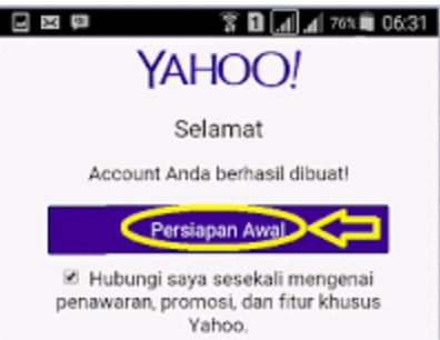(l). Silahkan tunggu proses membuat akun baru yahoo indonesia dalam hitungan detik akan muncul halam baru dan di tandai dengan pesan seperti berikut ini “Selamat akun berhasil di buat” dan untuk melanjutkan klik tulisan “Pesiapan awal”.