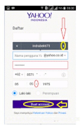 (c). Pengguna : Nama email Anda yang akan dibuat misalkan tadi memasukan nama depan dinda dan nama belakang erica atau Gabungan nama depan dan belakang maka otomatis nama email yang di proses akan seperti dindaerica @yahoo.co.id bila memang anda ingin menggunakan Yahoo Indonesia dan com Yahoo Global.