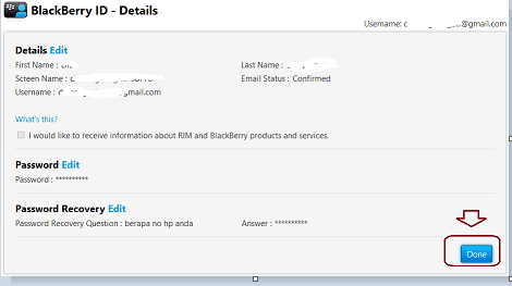 9). Halaman baru akan terbuka dan menyatakan proses reset atau mengatur ulang kata sandi/password blackberry ID sudah lancar dan sukses dan selanjunya Anda bisa membuka akun BB ID yang tadi tertutup karena lupa password/sandi dan klik tulisan “Done”.