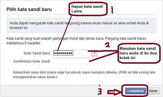6). Silahkan masukan kata sandi baru dan hapus kata sandi lama seperti kode titik-titik pada halaman ” Pilih kata sandi baru” dan selanjutnya klik tulisan “Lanjutkan”.