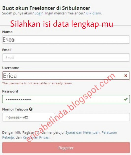 Kemudian akan terbuka halaman baru pendaftaran Sribulancer yang mengharuskan bahwa anda untuk mengisi data lengkap pada formulir yang sudah disediakan dan silahkan isi dengan sebenar-benarnya agar dalam pendaftaran akan berjalan lancar dan di terima oleh pihak Sribulancer yang memberi kesempatan kerja.