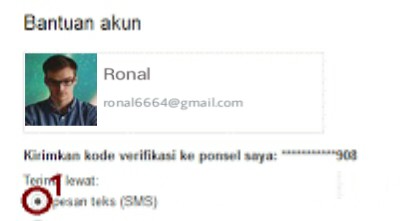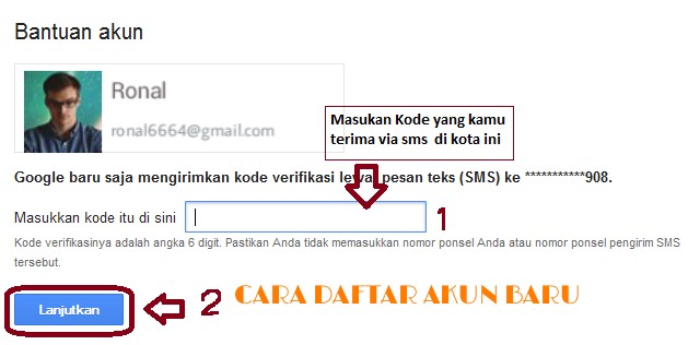 6). Halaman “Bantuan Akun” tunda sebentar dan silahkan cek nomor ponsel anda dan lihat pesan baru dari tim google dan masukan kode yang diberikan ada 6 digit selanjutnya kembali lagi browser Anda pastekan atau simpan di kotak ” Masukan Kode di sini” kemudian klik tulisan “Lanjutkan”.