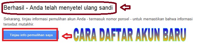 7). Otomatis halaman baru akan terbuka sebagai halaman konfirmasi dari google dengan pesan seperti ini : Berhasil anda telah menyetel ulang password/kata sandi dan kemudian klik tulisan “Tinjau info pemulihan saya” untuk mengamati dokumen pada akun email google Anda dan bila sudah terasa cukup lengkap silahkan klik tulisan “Keluar atau sign out”.