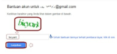3). Setelah itu akan terbuka halam baru yang menyatakan “Bantuan Akun ******@gmail.com” selanjutnya silahkan masukan kode captcha yang tersedia dan harus sama dan kemudian klik tulisan “Lanjutkan”.