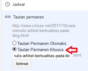 Permalink adalah URL link pada satu halaman blog, pengetikan URL Link sistem bawaan platform Blogger akan terpotong ketika Anda membuat sebuah judul yang panjang diatas 70 karakter, maka jalan keluarnya untuk sebuah permalink SEO friendly yakni mengetikan sendiri pada saat membuat sebuah judul pada bilah kanan dan klik saja pada Tautan Permanen kemudian ada 2 pilihan kemudian pilih saja “Tautan Permanen Khusus” seperti gambar dibawah penampakannya.