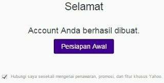 Selanjutnya Anda cukup menuggu sebentar pendaftaran akun baru yahoo Anda lagi di proses oleh dari Tim Yahoo, kemudian akan terbuka halaman baru yang memberitahukan bahwa Anda telah berhasil buat akun Yahoo Indonesia dengan tulisan “Selamat account anda berhasil di buat” Silahkan Anda klik tulisan “Persiapan awal” maka akan diarahkan ke halaman baru profil ID Yahoo Indonesia baru yang sudah registrasi atau buat tadi.