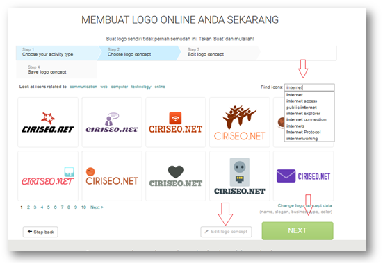 Logo Anda sudah bisa dilihat dari berbagai corak warna dan font yang sangat banyak pilihan dan lihat pojok atas kanan ditandai panah merah ada kotak pencarian Find Icon dan Anda bisa memasukan pilihan icon, Saya pilih kata Internet.